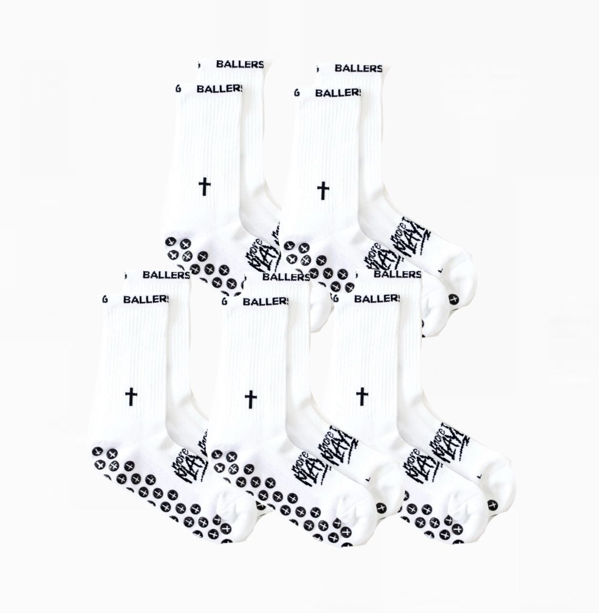 Crew length performance grip socks. Locked in comfort, reduced slippage and secures foot. Lightweight agility fit, worn by Ballers In God worldwide on match days. With Cross design sole grips. One size fits all adults Size 6-12.